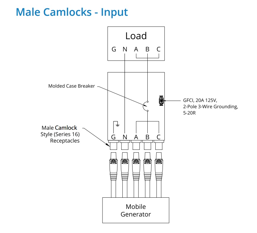 - Generator Connection: Series 16, 400A, 600V, male camlock receptacles (five sets of five).