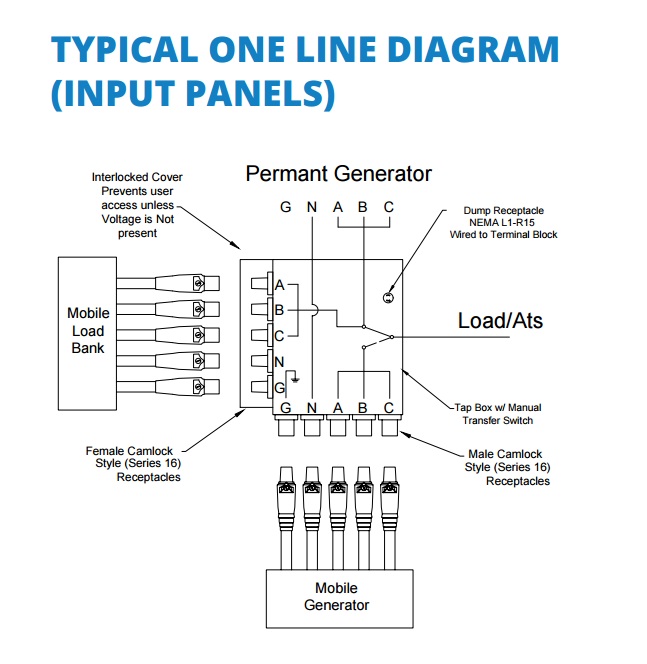 - Load Bank Receptacles: Series 16, 400A, 600V, female camlock receptacles (one set).