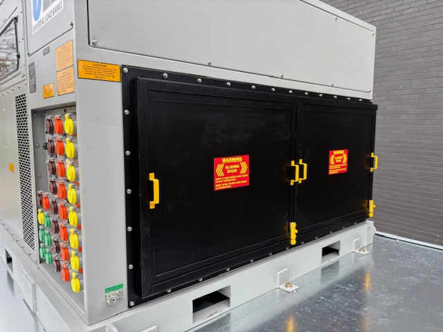 - Enclosure: Heavy gauge steel outdoor enclosure with powder coat finish. Designed to NEMA 3R standards for outdoor operation. Hinged access doors. Forklift pockets for easy mobility.